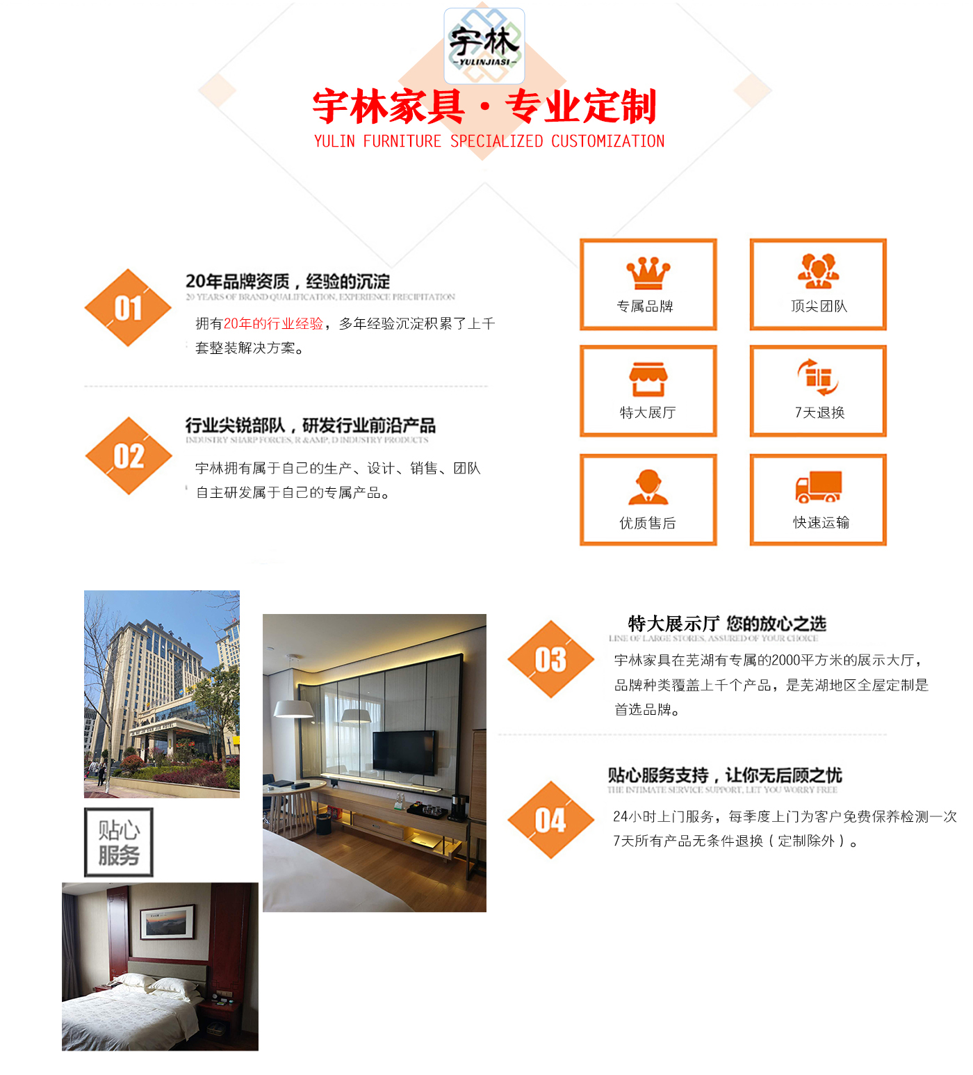 蕪湖宇林工貿(mào)有限公司創(chuàng)建于1996年,位于蕪湖高新技術(shù)開(kāi)發(fā)區(qū)南區(qū),占地面積13000余平方米。是一個(gè)集研發(fā)、設(shè)計(jì)為一體的綜合性公司,公司主營(yíng)整體家居定制、酒店家具定制、娛樂(lè)場(chǎng)所配套家具以及軟體系列,團(tuán)隊(duì),銳意革新、進(jìn)去不息的理念,逐漸成為蕪湖家具行業(yè)的生產(chǎn)廠家,并在2006年注冊(cè)了“宇林”牌商標(biāo)。宇林品牌家具依現(xiàn)代與古典相結(jié)合的多種實(shí)木家具、實(shí)木貼皮家具。家具做工精細(xì),多用人工雕刻;其自然、典雅的風(fēng)格在很大程度上引導(dǎo)著人...